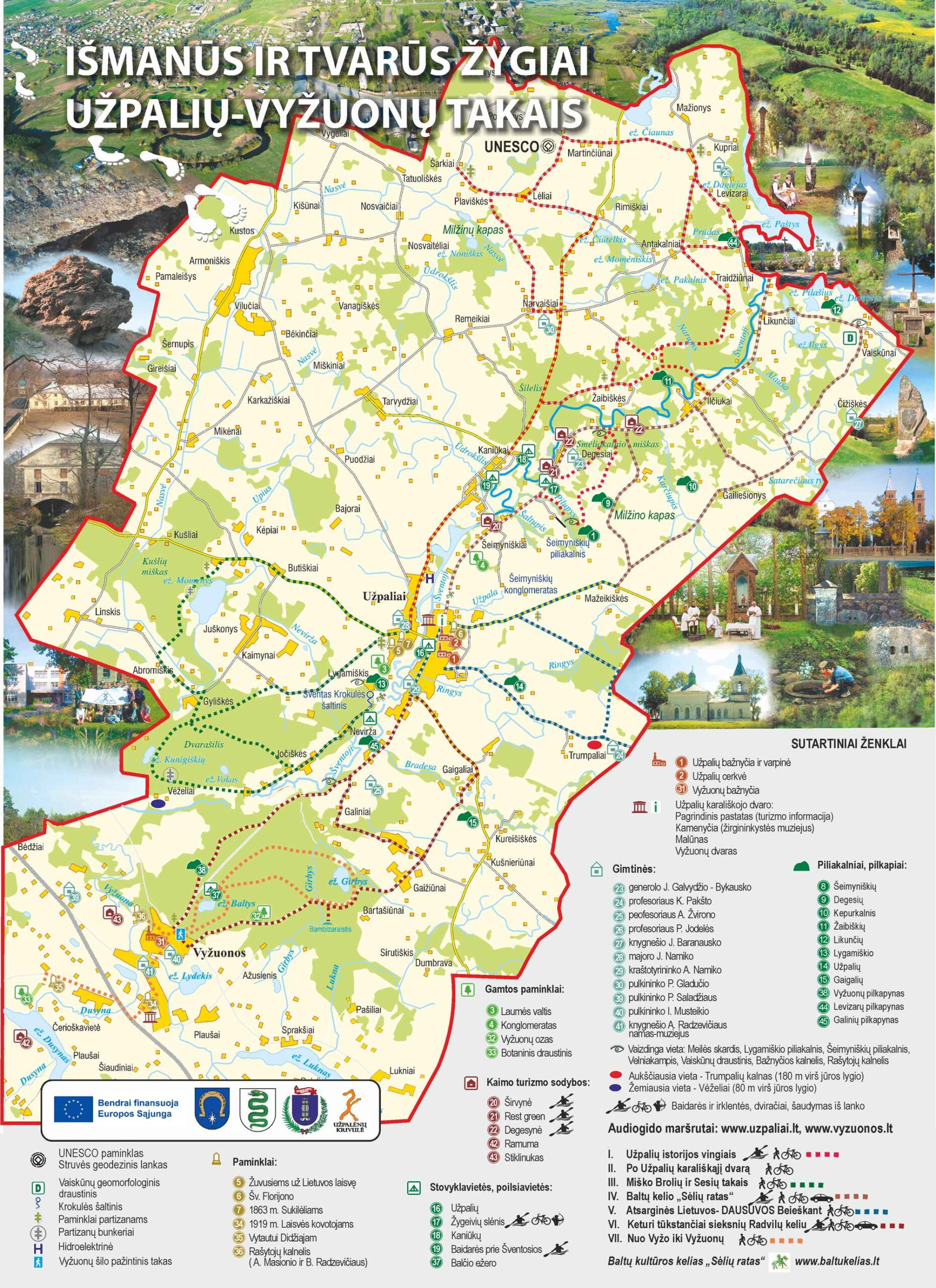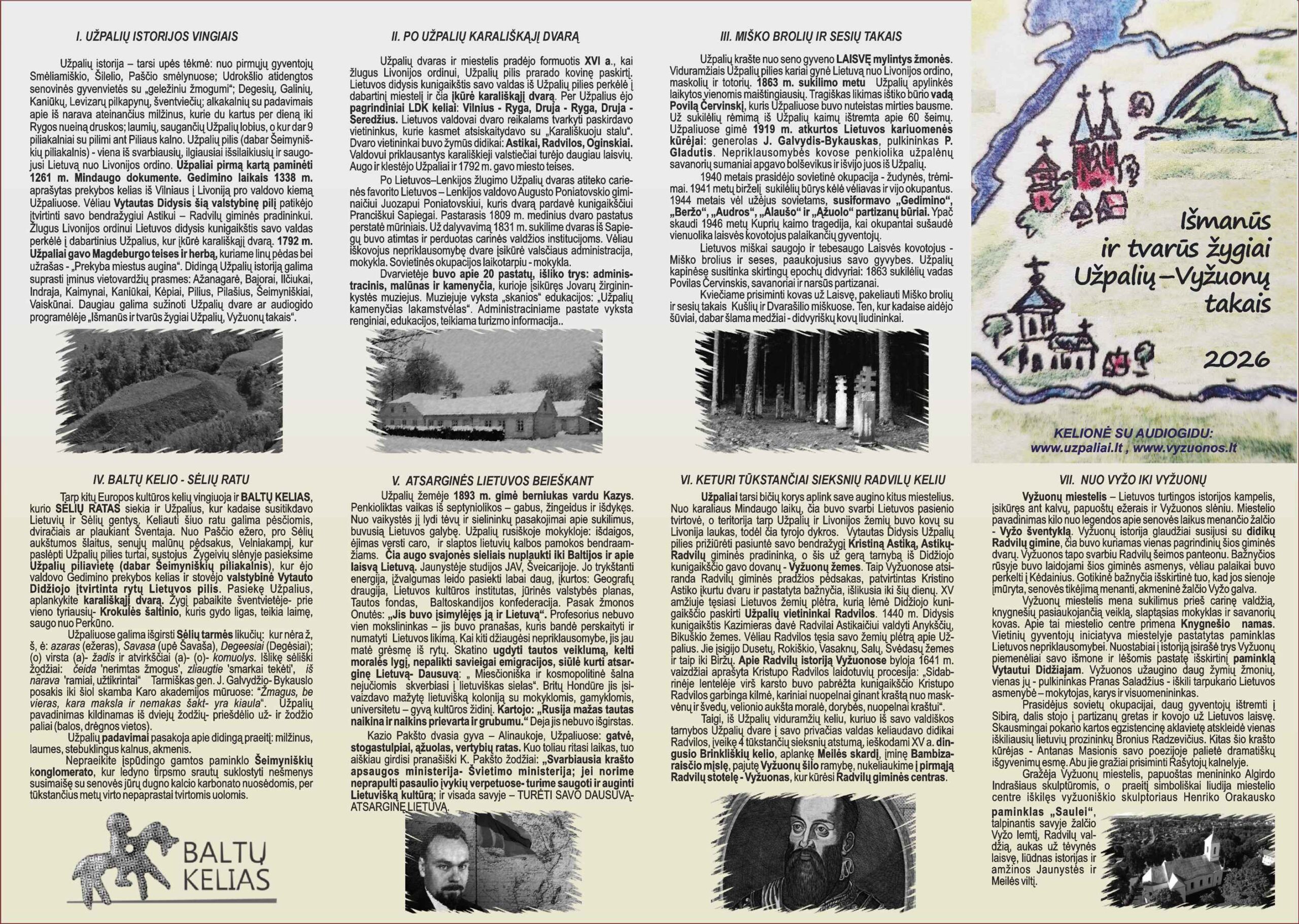 Šventosios upė ir bendra istorija. Svarbią vietą šiame krašte užima kunigaikščių Radvilų palikimas. Projekto metu sukurti 7 audio gido pažintiniai maršrutai, leis savarankiškai pasirinkti tinkamą maršrutą.Žygiai orientuoti į pėsčiųjų ir dviračių turizmą. Su audio gido programėle galite susipažinti: Žygiai UŽPALIAI - VYŽUONOS – Apps on Google Play→ (pastebėjimus prašau siųskite: Šis el.pašto adresas yra apsaugotas nuo šiukšlių. Jums reikia įgalinti JavaScript, kad peržiūrėti jį.) Utenos turizmo informacijos centras parengė pažintinių maršrutų pristatymus internetinėjesvetainėje. Visos minėtos paslaugos, Utenos rajone besilankantiems turistams, padės sudaryti patrauklius, tvarius maršrutus ir pasinaudojant audio gidu išsamiai pažinti Užpalių ir Vyžuonų gamtos ir kultūros paveldo vertybes. Informacija apie maršrutus, paslaugas bus skelbiama pareiškėjo, partnerio, Utenos verslo ir turizmo agentūros ir „Keliauk Lietuvoje" socialiniuose tinkluose. Pirmieji pristatomieji „Išmanūs ir tvarūs žygiai Užpalių–Vyžuonų takais“, pėsčiomis ir dviračiais, bus organizuojami vadovaujant gidui Giedriui Indrašiui, jau 2026 m. gegužės mėnesį.| Maršrutas | Pristatymas | Aprašymas |